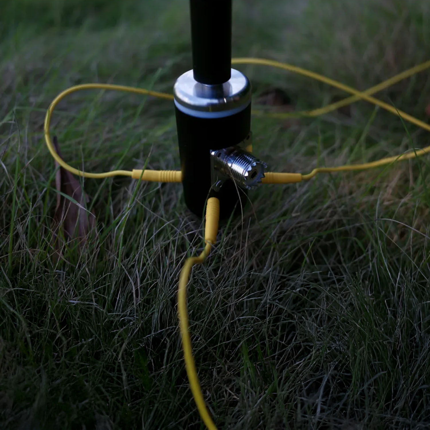 Die MC-750 ist auf schnellen Auf- und Abbau ausgelegt: Antennenfuß platzieren, Strahler aufsetzen, Radials anschließen – und schon ist man QRV. Alle Strahler sind deutlich markiert, sodass keine Messmittel zur Abstimmung benötigt werden. Eine zusätzliche Abspannung ist nicht erforderlich.
