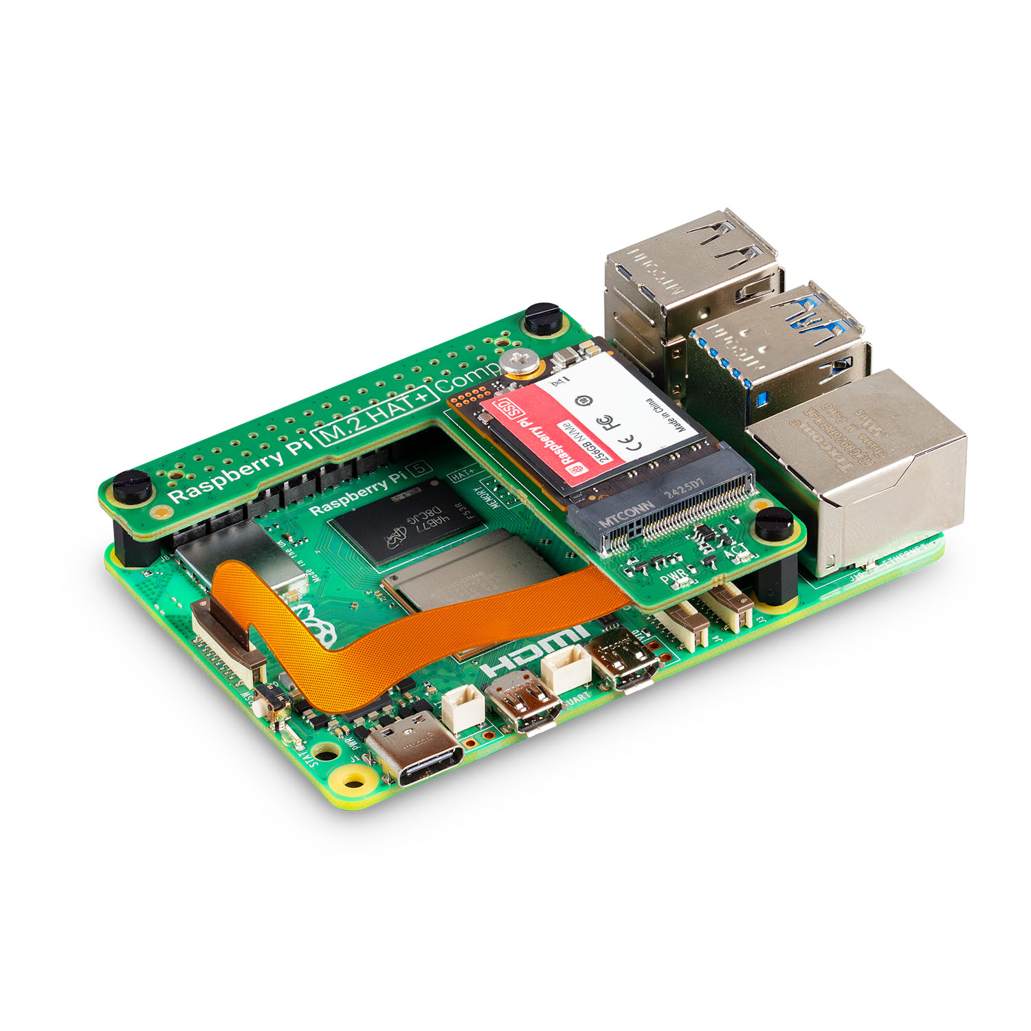 Der Raspberry Pi M.2 HAT+ Compact ermöglicht den Anschluss von M.2-Hardware wie zum Beispiel den NVMe-Laufwerken und KI-Beschleunigern an die PCIe-2.0-Schnittstelle des Raspberry Pi 5 und unterstützt eine schnelle Datenübertragung von bis zu 500 MB/s.