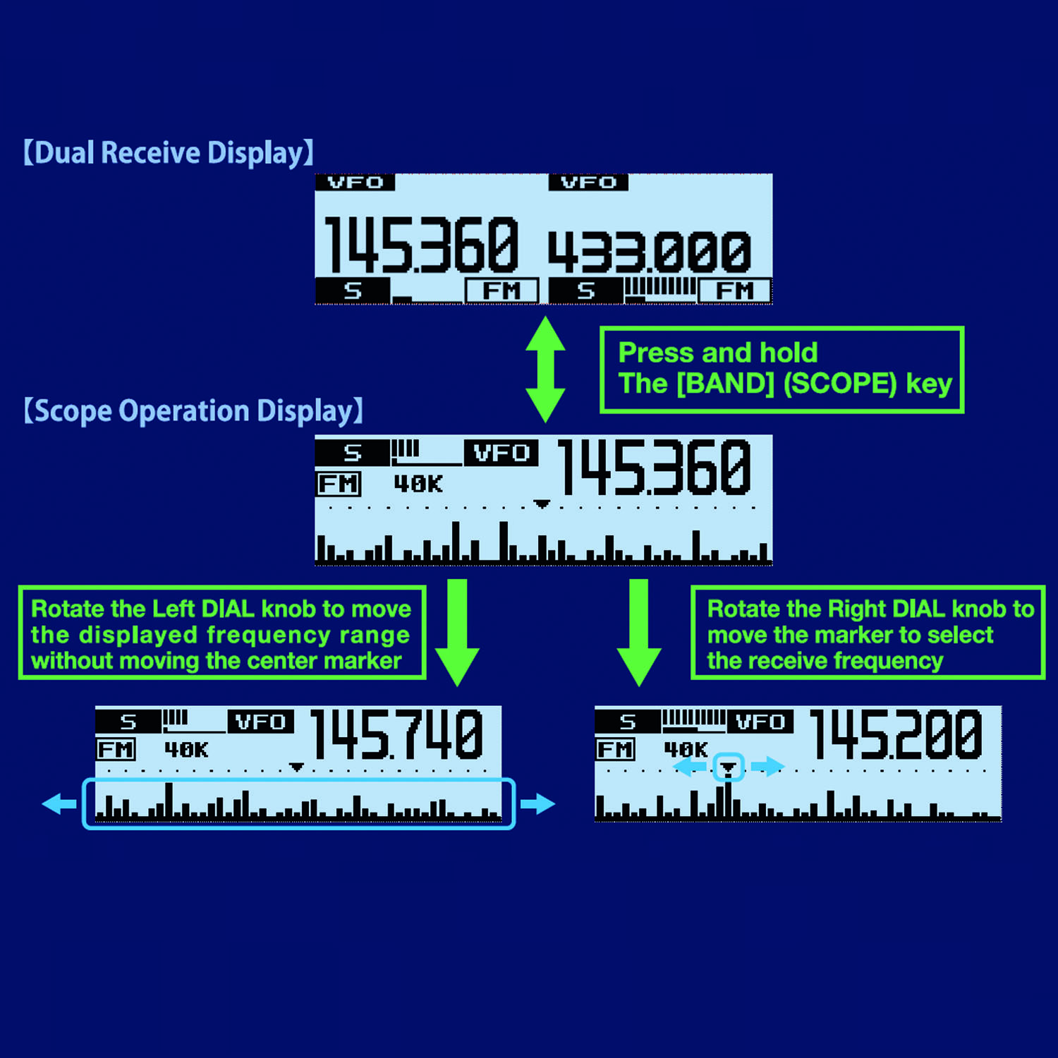 - Bänder RX: wideband von 108 MHz bis 550 MHz in FM / C4FM und AM