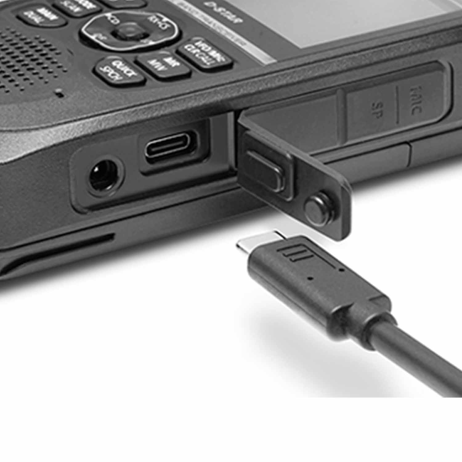 Das ID-52E verfügt über einen Multifunktions-USB-Port sowie eine USB-Host-Funktion zum Laden des Akkupacks, zur PC-Programmierung, zum Lesen bzw. Schreiben von Daten auf die Micro-SD-Karte, zur Unterstützung des Terminal- und Access-Point-Modus sowie zur CI-V-Steuerung und zur NF-Übertragung.