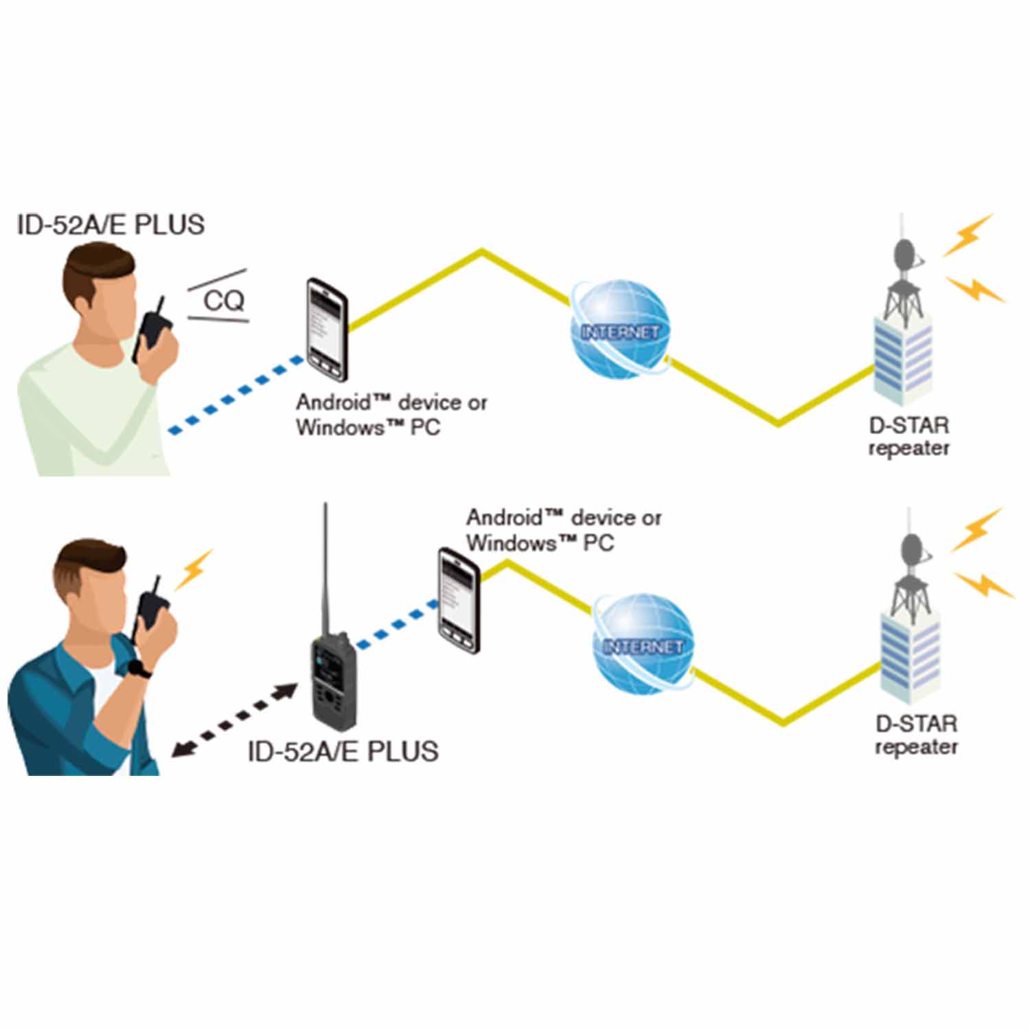 Das ID-52E lässt sich über einen Windows®-PC oder ein Android™-Gerät mit dem Internet verbinden. Das Internet-Gateway ermöglicht mithilfe von Terminal- oder Access-Point-Modus den Zugriff auf das D-STAR-Repeater-Netzwerk auch aus Gebieten, in denen kein D-STAR-Repeater direkt über Funk erreichbar ist.